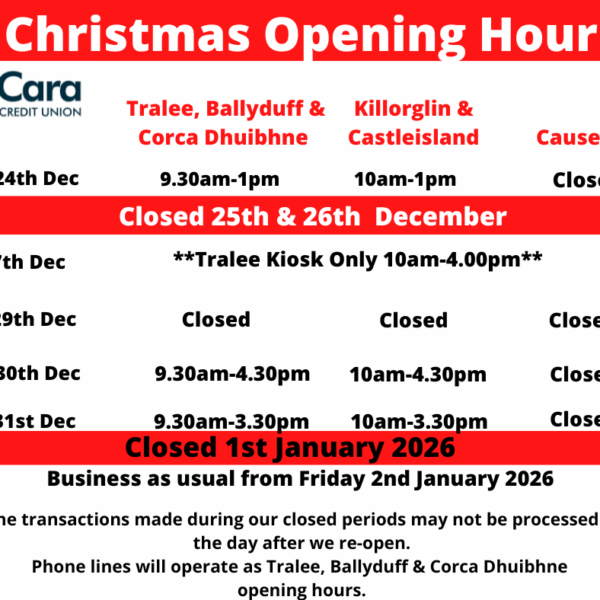 Cara Credit Union Christmas Opening Hours 2025 For 24/7 access to your Cara Credit Union account please download the Cara Credit Union app. Normal operating hours will resume 2nd January 2026. Wishing all our members a very Happy Christmas and a peaceful New Year.