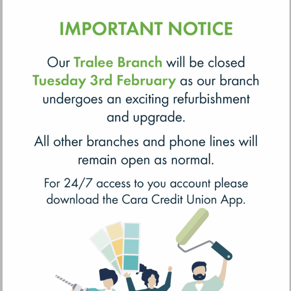 Please Note Our Kiosk Lobby In Our Tralee Branch Will Be Closed On Saturday 24th January and Saturday 31st January. This Temporary Closure Is To Facilitate Refurbishment Work. We Apologise For Any Inconvenience Caused And Appreciate Your Understanding. For 24/7 Access To Your Cara Credit Union Account Please Download The […]